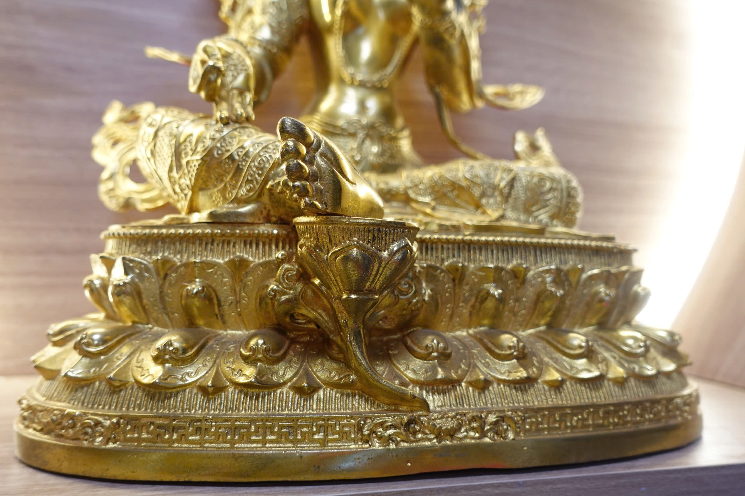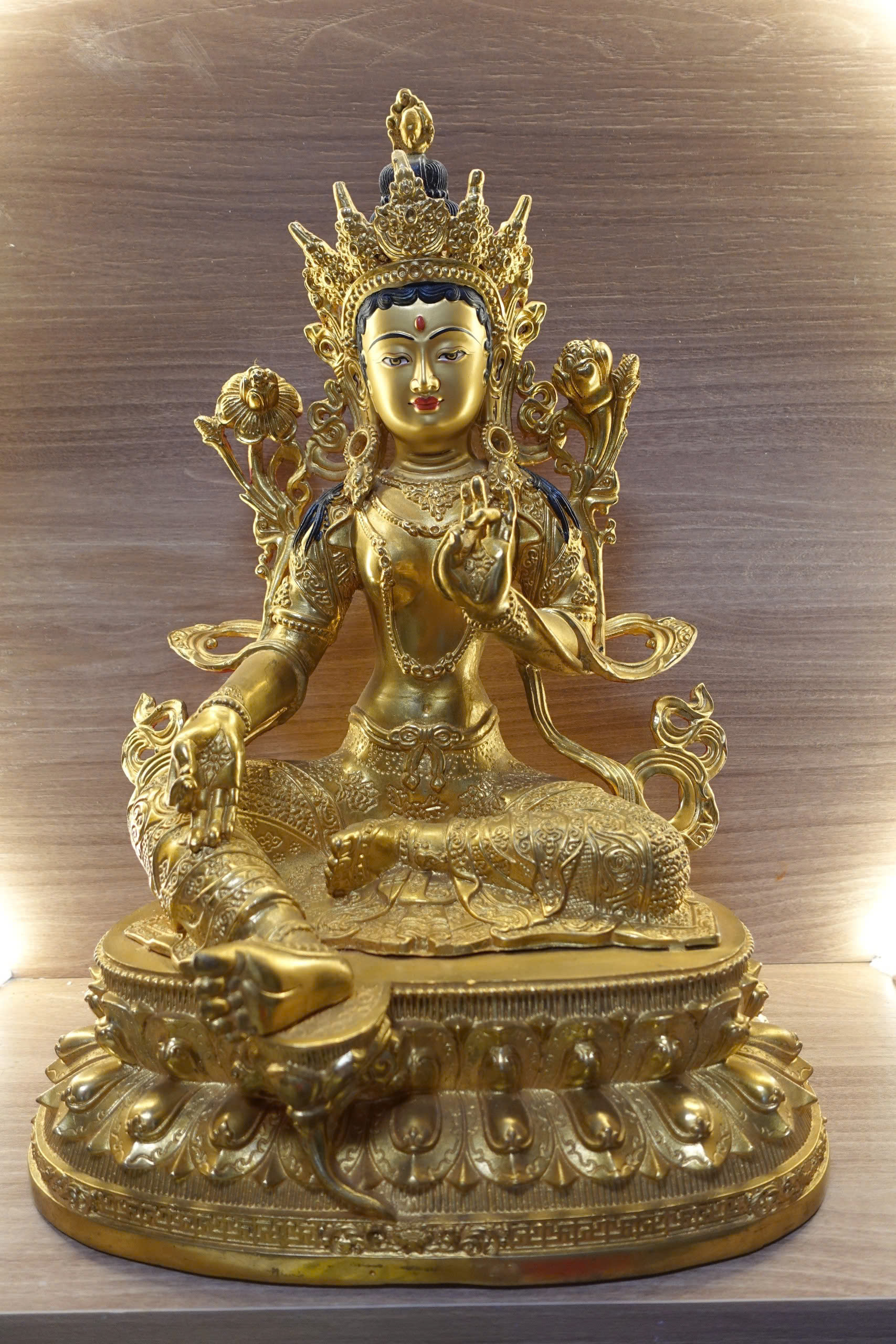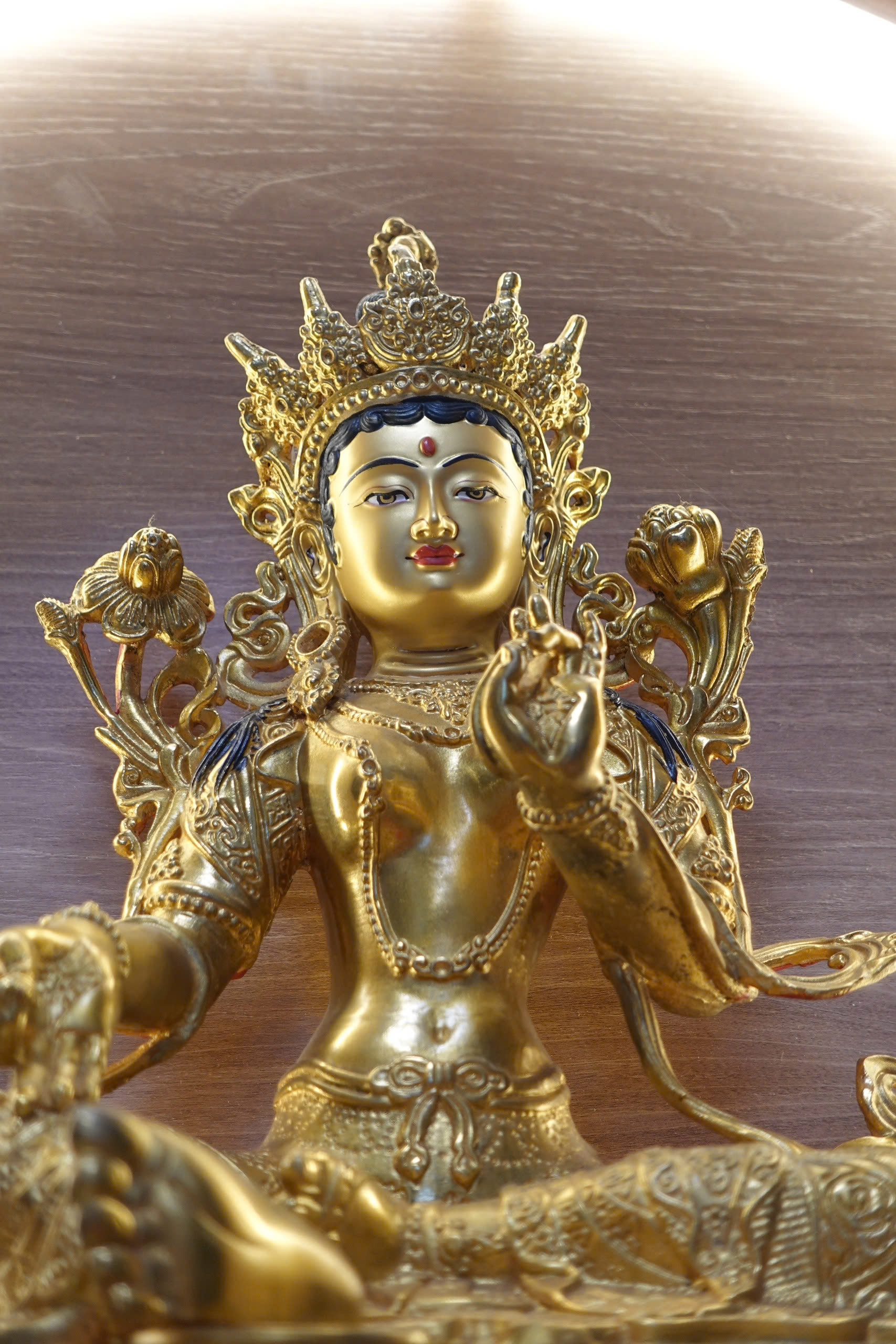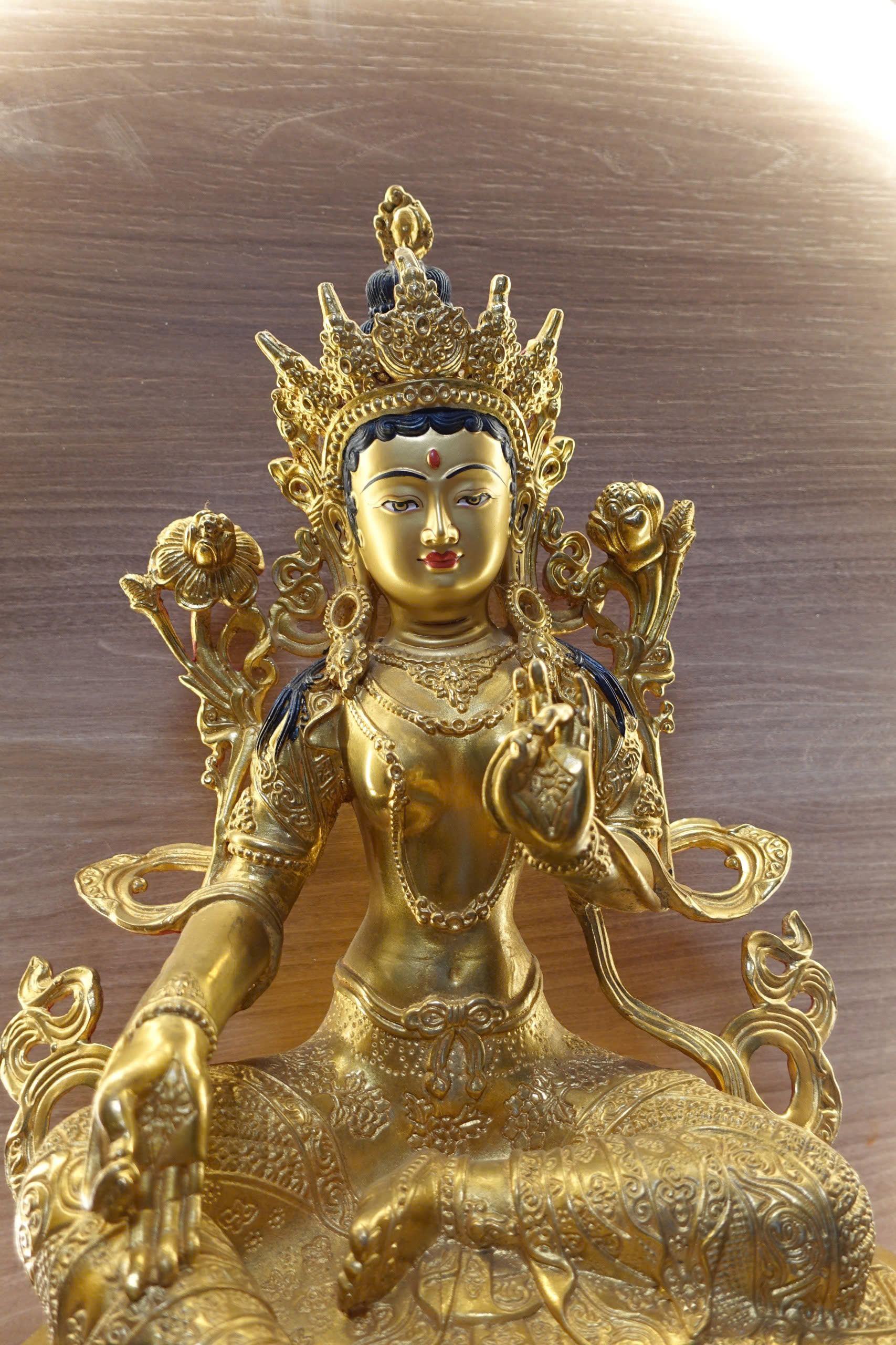 Đức Tara Xanh được minh họa bằng một chân bước ra khỏi vị trí tòa hoa sen. Mở rộng để đáp ứng mọi yêu cầu của chúng sinh nhanh chóng. Nữ thần giữ hoa sen xanh – biểu tượng cho sức mạnh của trí tuệ và sự thuần khiết. Ở trong tay phải và được giữ ở ngực; bàn tay trái ngửa lên, lòng bàn tay hướng ra ngoài. Đó là Abhaya Mudra – cử chỉ của nơi trú ẩn và không sợ hãi.